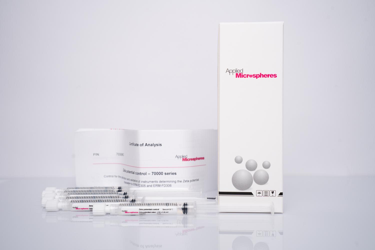 Applied Microspheres’ Zeta Potential Controls are available in single-use, 3 mL or 10 mL Luer-Lok™ syringes, packaged in boxes of 6 or 10 syringes. The shelf life is 12–18 months based on the date of production and can be stored at room temperature.